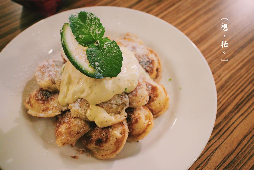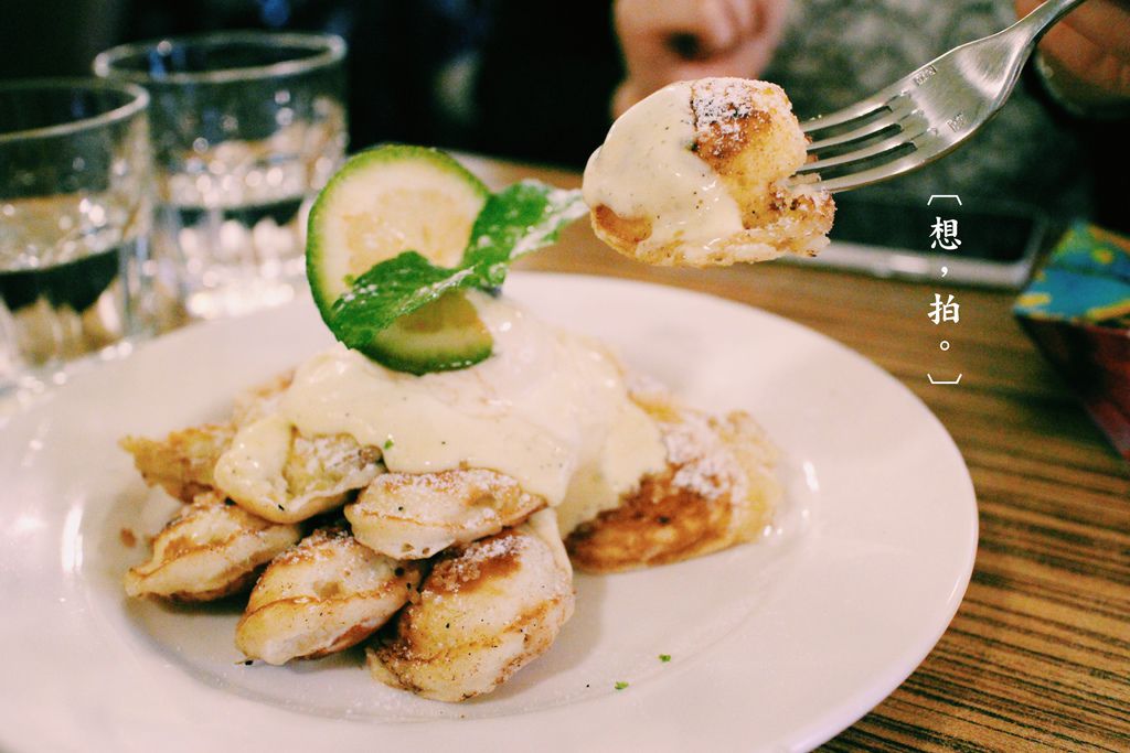火烤小鬆餅Q彈有蛋香,配上酸到耳後的檸檬奶油,沾上糖粉,口口都是美味。