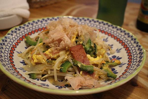 必點的家庭料理--沖繩炒苦瓜,這間運用火腿為基底,炒蛋、洋蔥、苦瓜、豆芽,佐料酸甜好吃。