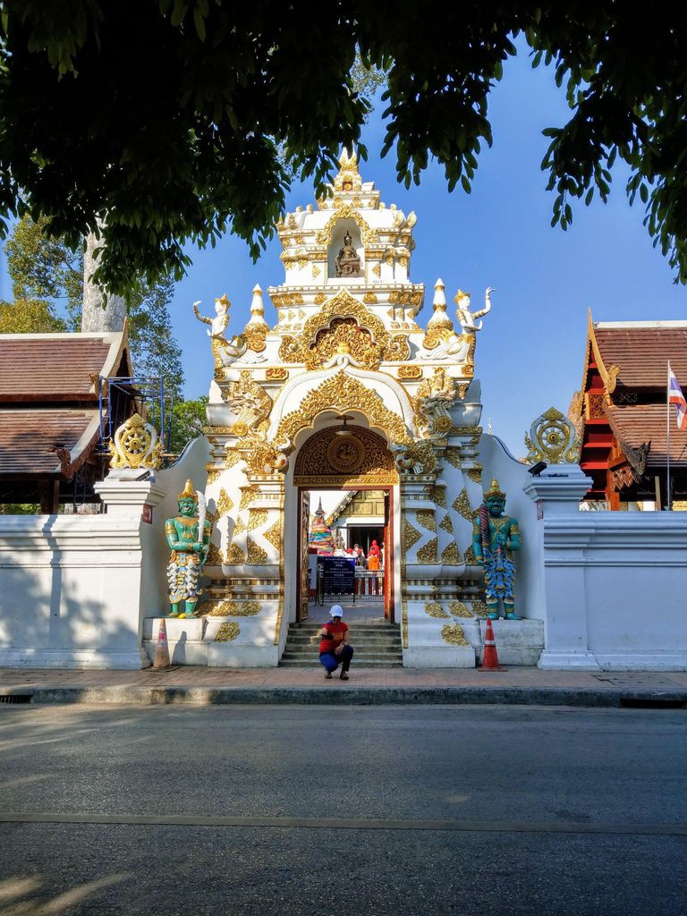 歷史簡述: 清邁市中心的佛教廟宇,以蘭納王朝為主,後來加上了泰國暹羅王朝的風格,為當時清邁最高的建築,曾因為地震而倒塌,目前重建過,從磚牆裡一尊尊的大象栩栩如生,只有一支是真品,其他皆為仿作,但其實查遍網頁我也不知道何為真品?